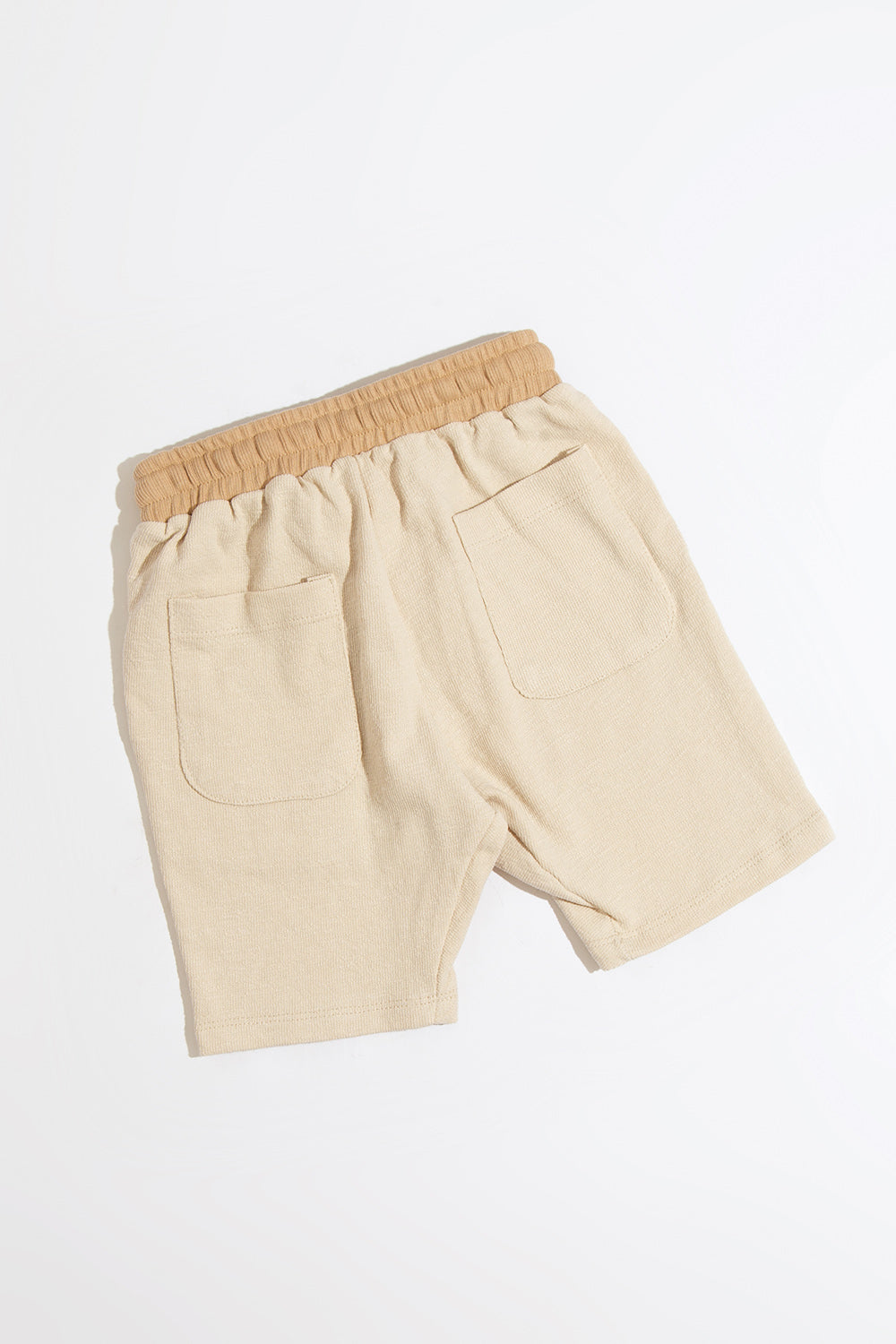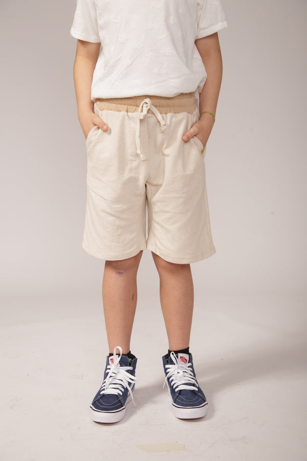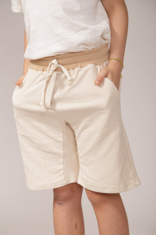 O elástico na cintura proporciona um ajuste perfeito, enquanto o cordão adiciona um toque de charme e ajustes praticos. O comprimento acima do joelho mantém os pequenos frescos, perfeitos para os dias de calor. As cores neutras conferem um visual moderno e versátil, adequado para todas as ocasiões.