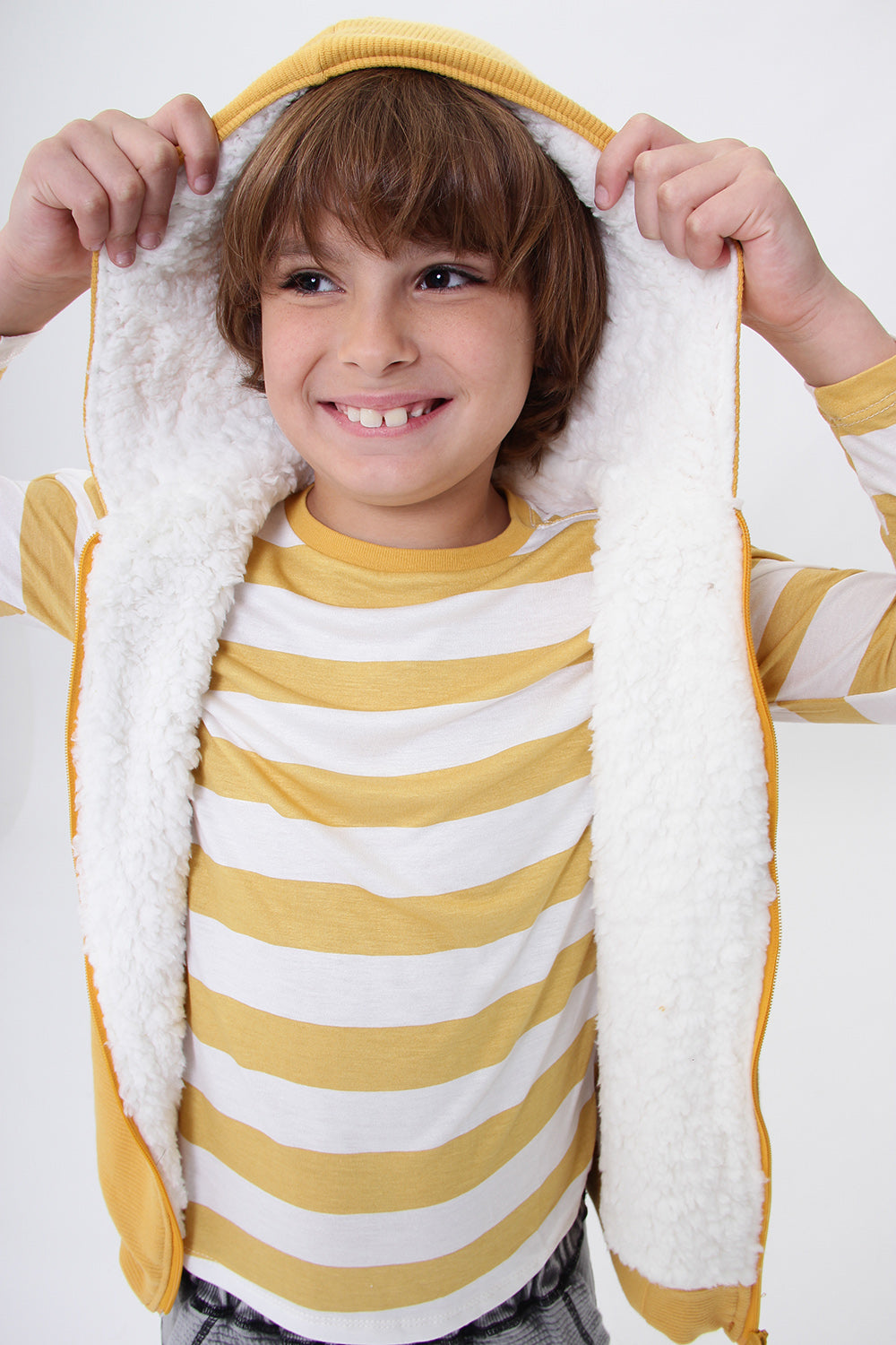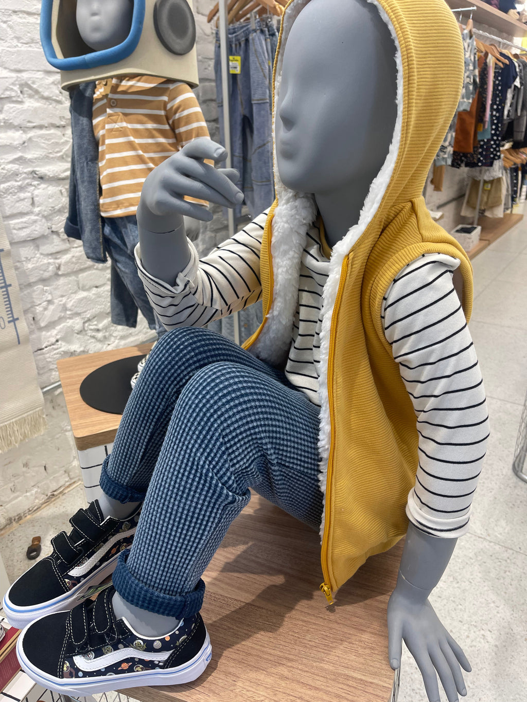 O colete infantil unissex é uma peça funcional e versátil para as crianças. Confeccionado em moletinho texturizado na cor mostarda, o colete possui um toque suave e um visual moderno.