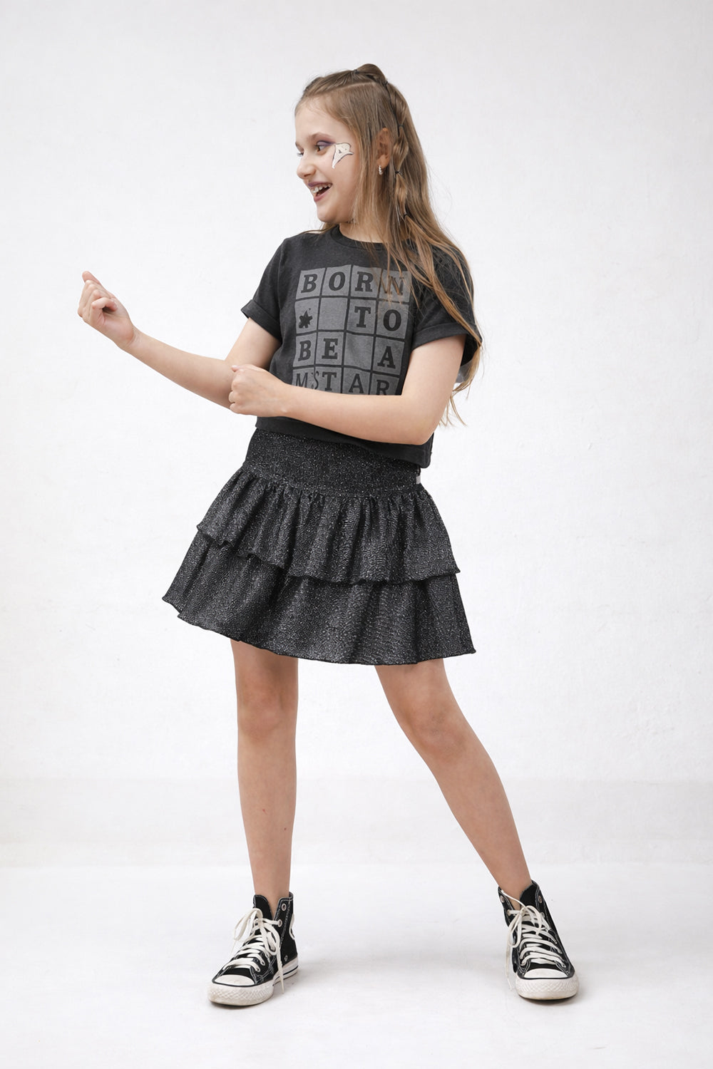 Cheia de movimento e brilho delicado, a Saia Babados é confeccionada em malha com leve lurex na trama — um toque sutil que encanta em cada passo. As camadas sobrepostas criam um efeito rodadinho e fluido, perfeito para acompanhar os momentos mais especiais das pequenas.