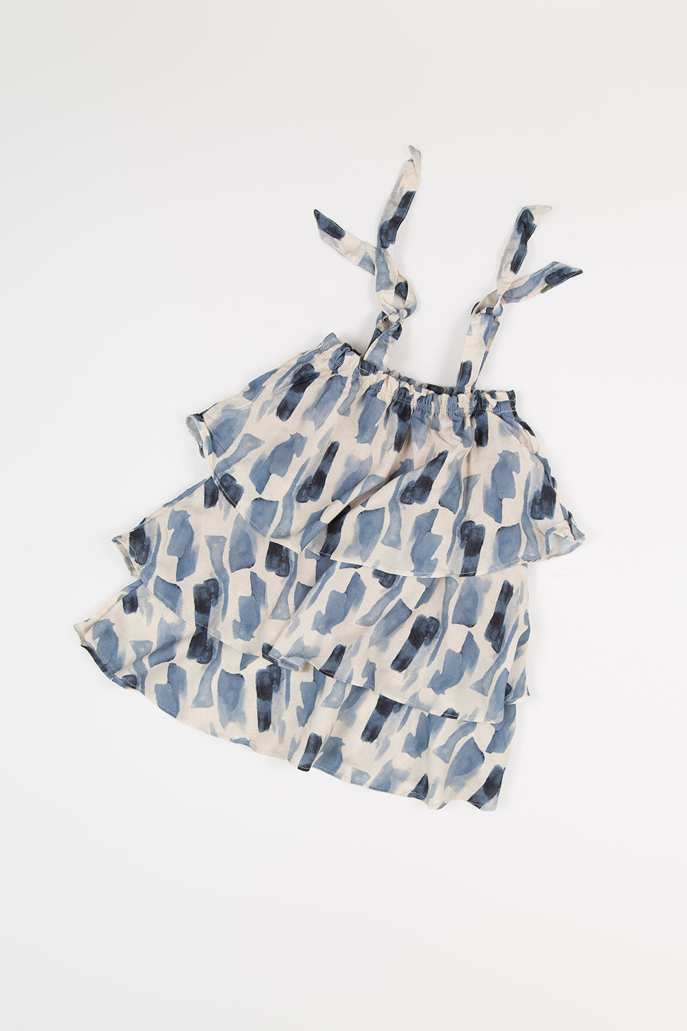 Confeccionado em viscose estampada com pinceladas sobre fundo off, possui um visual sutilmente artesanal e delicado — um toque único que deixa a peça ainda mais especial, sem perder o frescor.